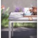 Das stabile pulverbeschichtete Aluminiumgestell sorgt für hohe Standfestigkeit, Langlebigkeit und Wetterbeständigkeit. Die edle HPL-Tischplatte ist besonders robust, pflegeleicht und widerstandsfähig gegen Witterungseinflüsse. Ein stilvolles Highlight bildet die Tischplatteneinlage aus recyceltem, gebürstetem Teakholz, die dem Tisch eine warme, natürliche Note verleiht und den modernen Look harmonisch ergänzt.